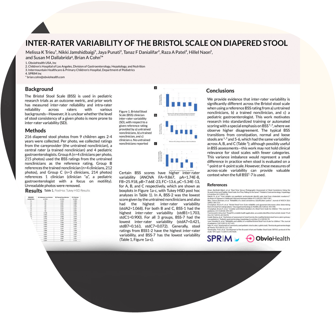 This study collected and compared stool ratings from caregivers (Group A), central raters (Group B), and pediatric gastroenterologists (Group C) to discover whether the level of stool consistency of a given photo is more prone to inter-rater variability. The study's results evidence inter-rater variability that is different across Bristol Stool Scale (BSS), which motivates research into standardized training or automated scoring, with a special emphasis on BSS.
